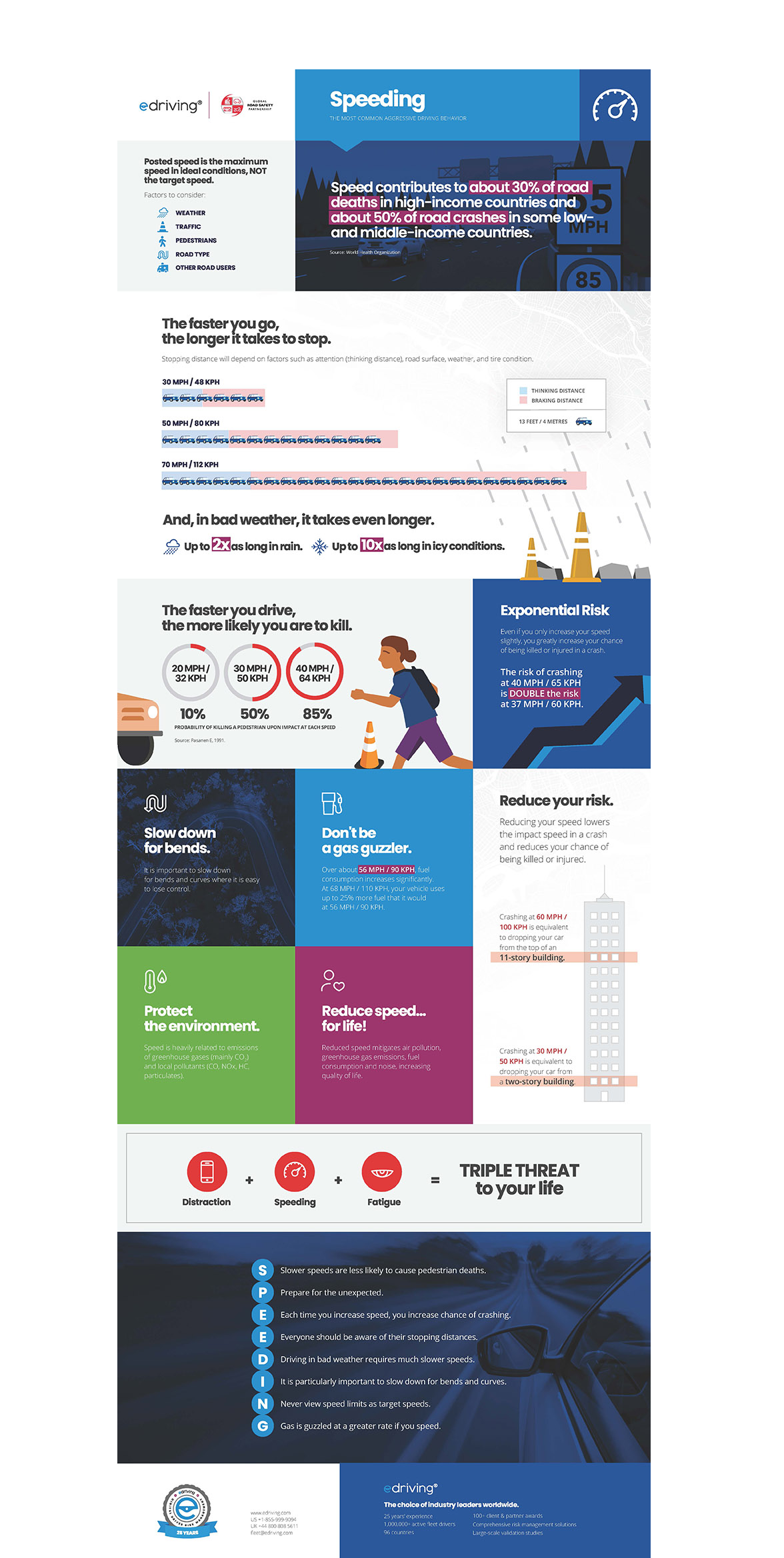 Speeding is one of the most aggressive and most frequently encountered behaviors behind the wheel. It contributes to about 30% of road deaths in high-income countries and about 50% of road crashes in some low- and middle-income countries (WHO). And, contrary to popular belief, speeding does not actually save you much time in your overall trip duration; however, it does put your life and the lives of others at risk. Also, did you know that speed limits are NOT the target speed for the road, but rather, the acceptable speed for ideal road and weather conditions?