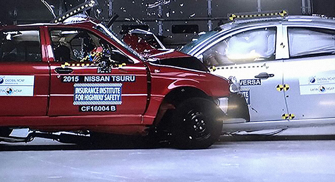 The test was conducted between the 2016 Nissan Versa, sold in the United States, and the 2015 Nissan Tsuru, sold in Mexico. Both cars are manufactured in Mexico and have been previously tested by the IIHS and Latin NCAP respectively, the Versa obtained a performance of Good (equivalent to 5 Stars) and the Tsuru was rated Zero Stars.